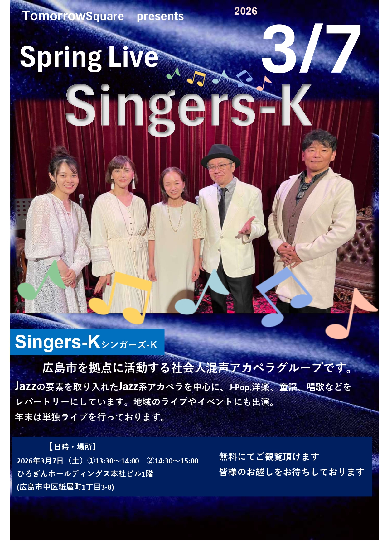 | 2023/05/28 | 親水テラス(原爆ドーム対岸) | 水辺のコンサート | ・Acappella in Acapulco ・未来予想図II ・アカペラでゆこう ・糸 ・涙そうそう ・風になりたい |